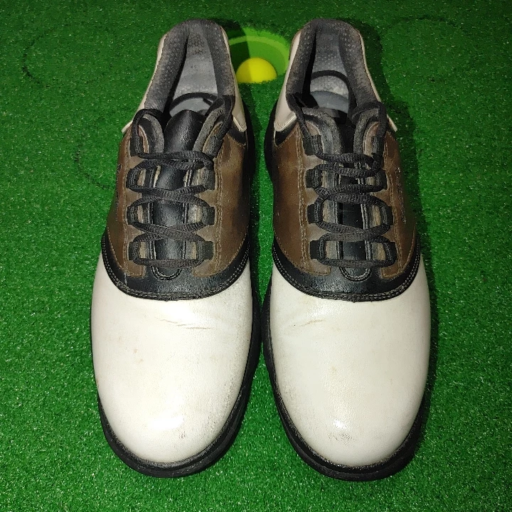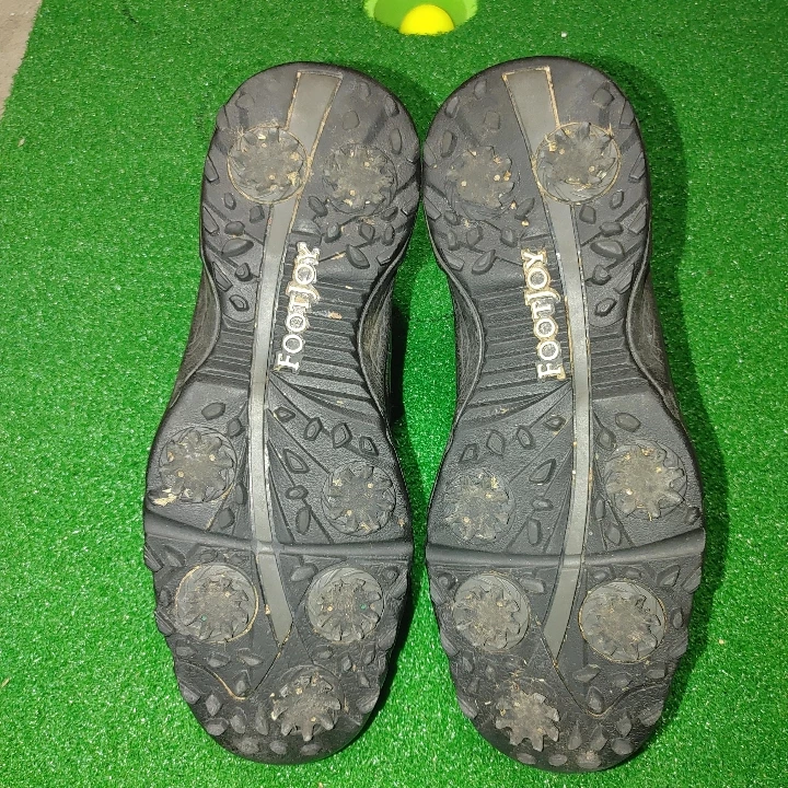An older pair of FootJoy GreenJoys in good condition. The spikes still have life on them and the shoes themselves are still solid. Just a few random scuff marks from on the course.
